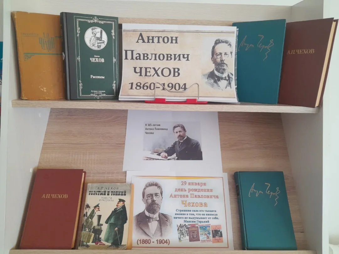 В школьной библиотеки оформлена книжная выставка,посвящённая юбилею со дня рождения русского писателя А.П. Чехов.