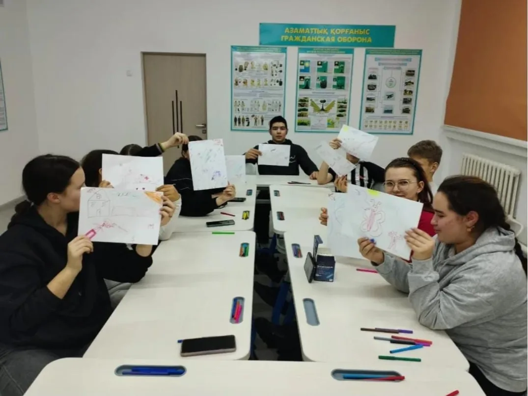 👨🏫 Психолог КГУ «Калиновская СОШ» Амайзер Евгений Иванович предложил ребятам создать общий рисунок на большом листе бумаги. Каждый ребенок добавлял свою часть в общий рисунок, учась самовыражению и уважению личных границ других.